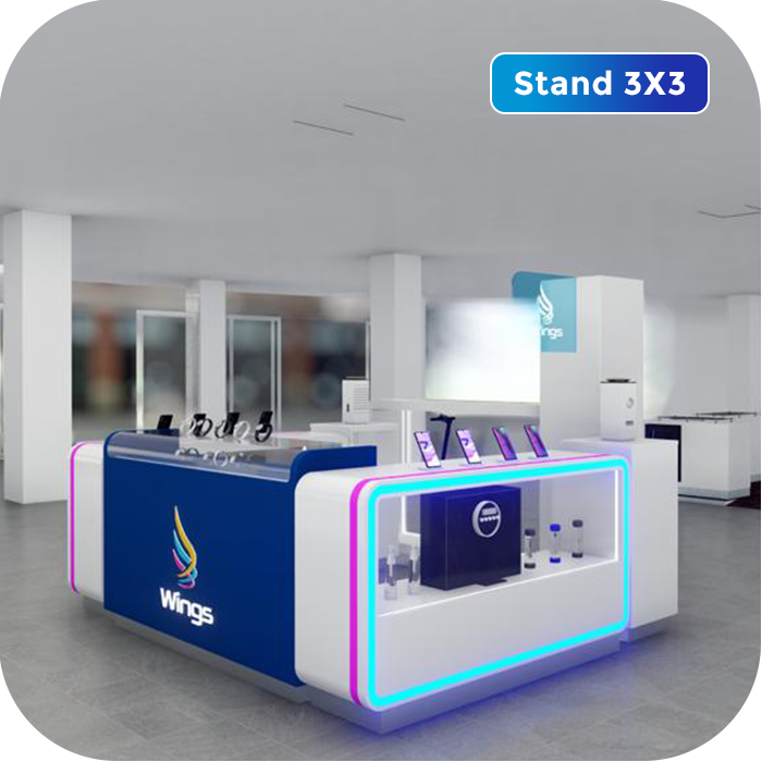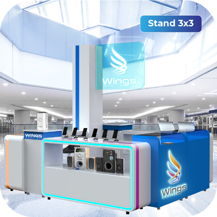 - 2 módulos azules de 1.20 m: Cobertura superior de 15 cm de alto en acrílico para exhibición de productos pequeños. Cuentan con dos estantes internos de 1 m de alto x 90 cm de ancho para guardar productos de la marca. Uno de ellos lleva en la parte frontal el logo de Wings Mobile a color con luz blanca, el otro es liso.