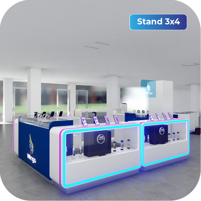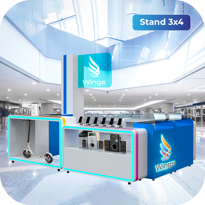 - 3 módulos azules de 1.20 m: Cobertura superior de 15 cm de alto en acrílico para exhibición de productos pequeños. Cuentan con dos estantes internos de 1 m de alto x 90 cm de ancho para guardar productos de la marca. Dos de ellos llevan en la parte frontal el logo de Wings Mobile a color con luz blanca, el otro es liso.